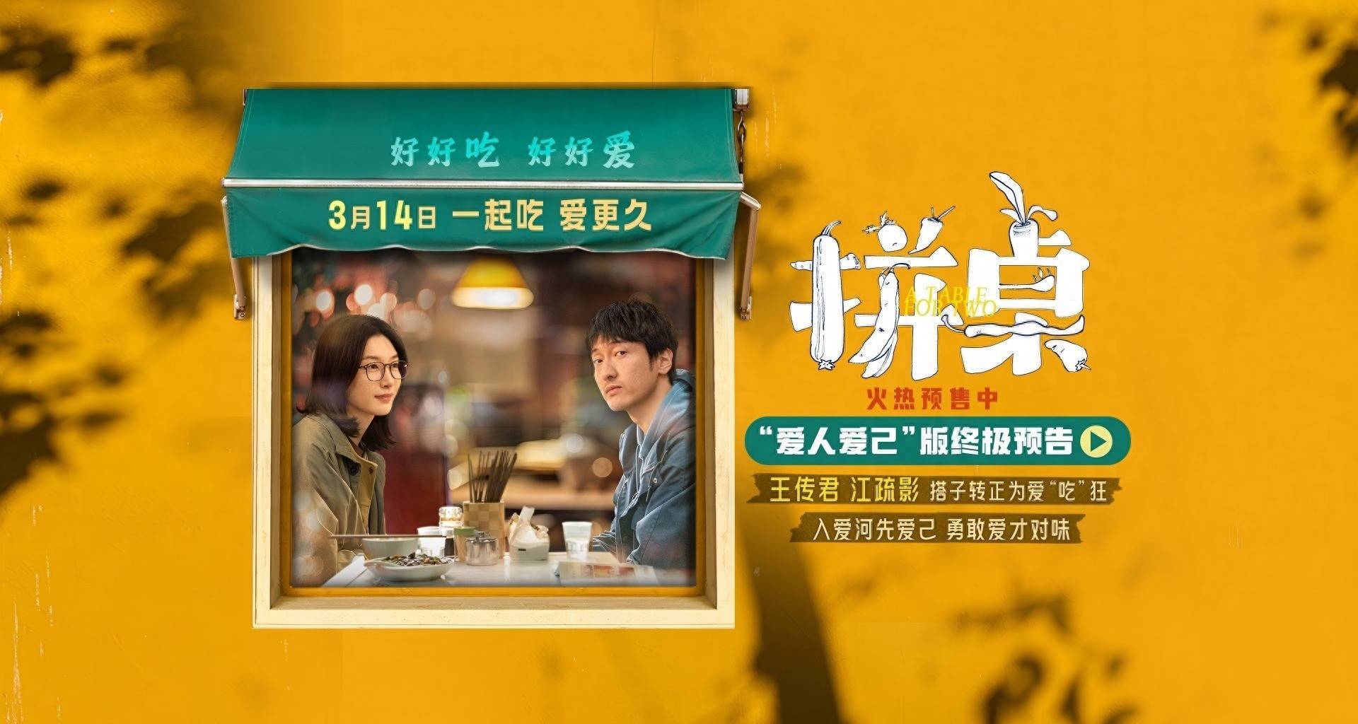 今日,由上影集团领衔出品,张律监制,陈洁担任制片人,吴靖担任编剧并执导,王传君、江疏影领衔主演,李雪琴、郑云龙、傅首尔、刘佳主演,王彩平、杜家毅特邀出演,吴冕、白举纲、田野(老四)特别出演,田小洁、罗海琼、齐溪、许龄月、葵葵友情出演的电影《拼桌》官宣开启预售,并发布“爱人爱己”版终极预告、“胃爱心动”版终极海报以及预售海报。由王传君饰演的陆拾谷对美食有着独到的见解,而由江疏影饰演的张嘉怡则对吃饭这件事充满仪式感,两个擅长用美食治愈生活的人因为拼桌相识成为饭搭子,在一次次的同频中滋养出微妙的默契与陪伴,开启了从“饭饭之交”到灵魂知己的同行治愈之旅。电影将于3月14日全国上映,王传君江疏影携手演绎同频老吃家的烟火气爱情,敬请期待!